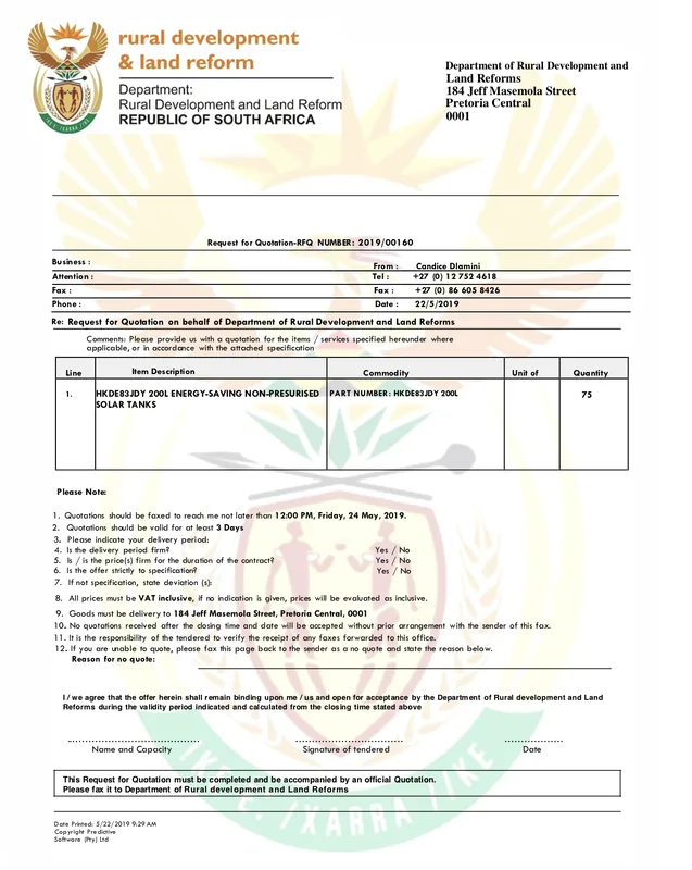 Department Of Rural Development and Land Reform - HKDE83JDY 200L Energy-Saving Non-Presurized Solar Tank Scam