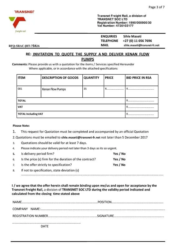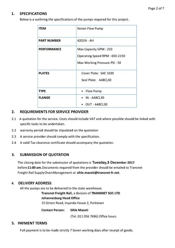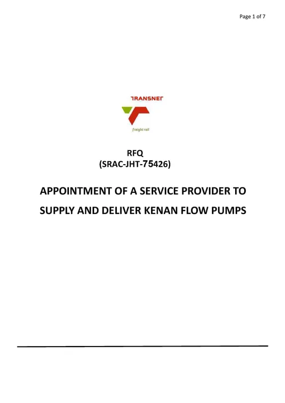 TRANSNET FREIGHT RAIL a Division of TRANSNET SOC LTD. Invites all interested parties to respond to Requests for QUOTATIONS or PROPOSALS as indicated to the supply and delivery of 35 Kenan Flow Pumps.